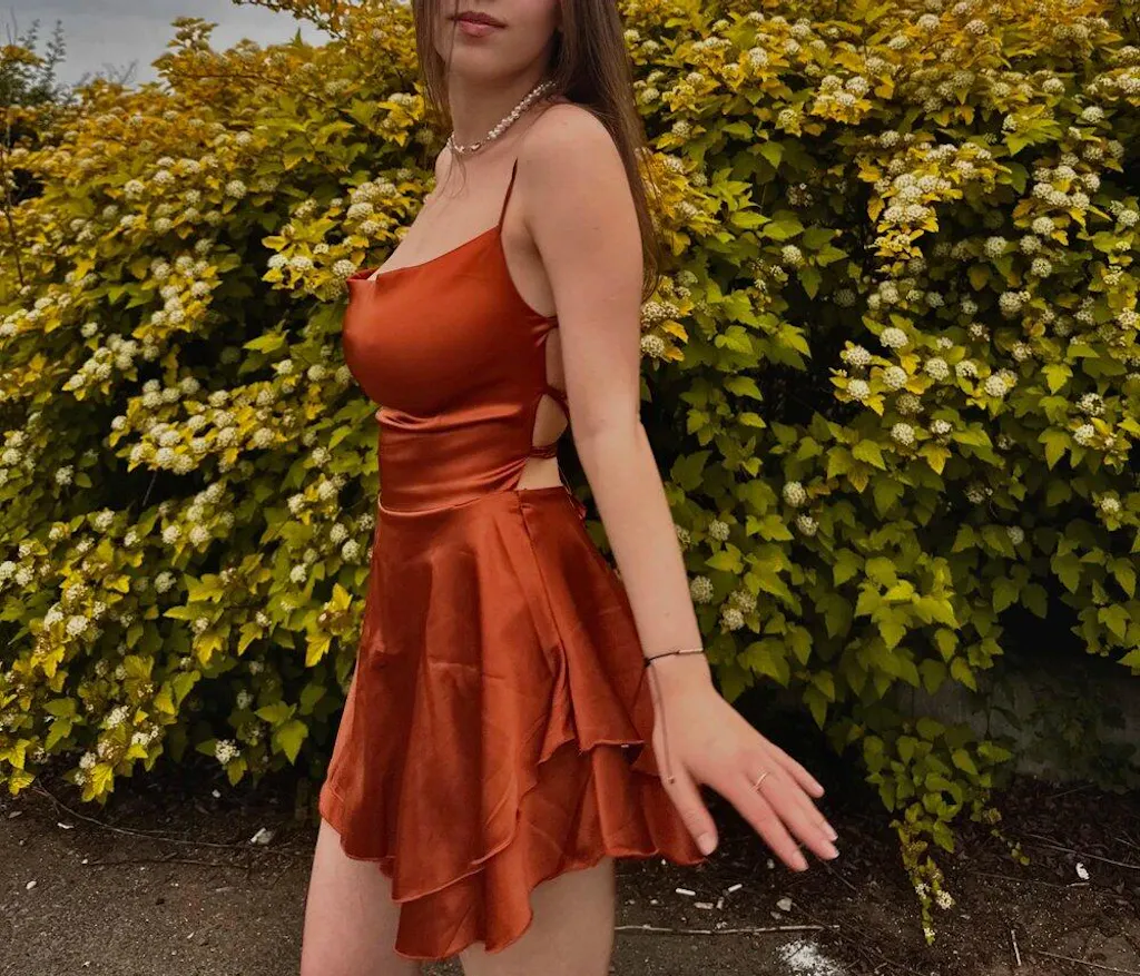 At 165 cm tall, the dress is still a bit short. It's fitted at the hips, with a flared hem on both sides. The fabric is thin satin.