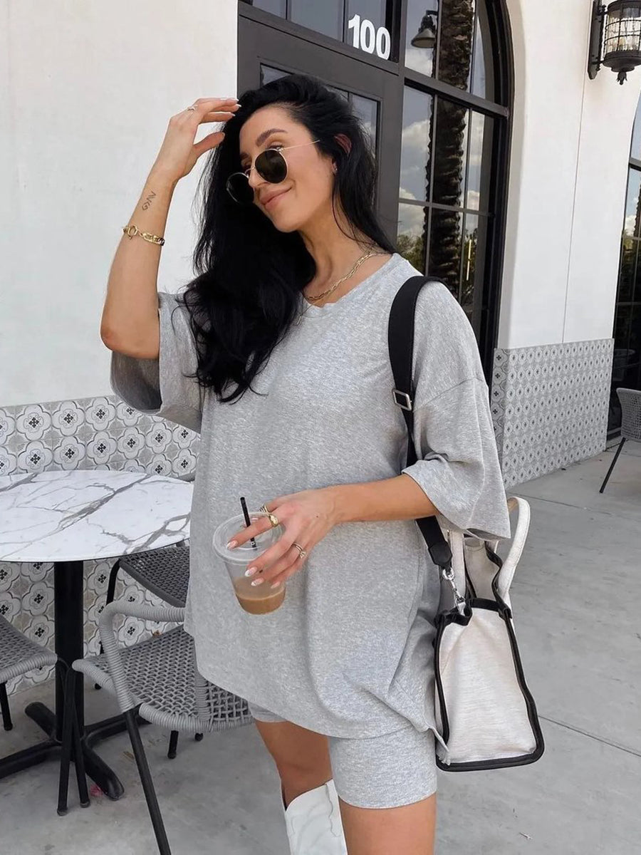 Your favorite Mayra T shirt is back in a new! You will be dressing this up for every occasion and dressing it down to wear around the house. This T shirt was made for EVERYBODY. This oversized Mayra tee comes with a pair of matching biker shorts. The material is soft, very stretchy and ribbed. The best part about these Mayra is they do not cut into your waist, they lay flat. They are tight enough to hold you in, but loose enough to feel relaxed and comfortable. The relaxed fit of this outfit has made it a 10/10.